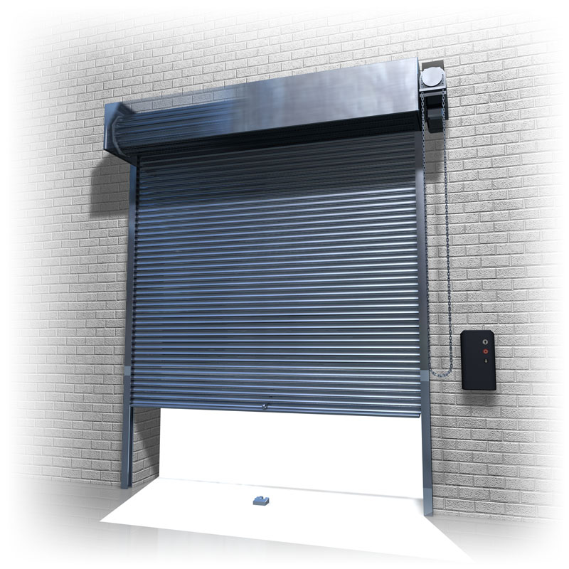 Steel Industrial Roller Shutter Door, comprising of 3” x 20 swg solid galvanised laths and 50mm straight steel guides.